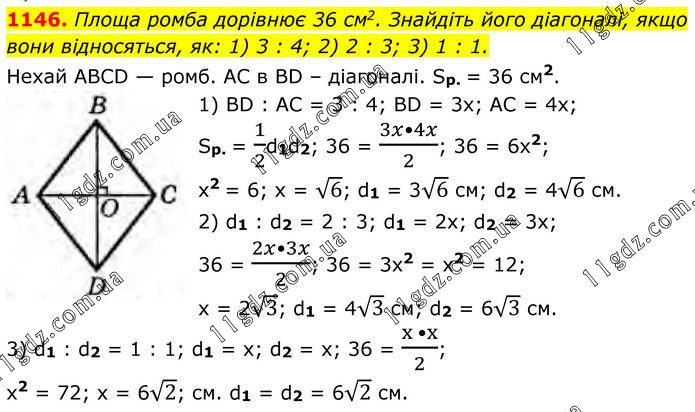 1146. Площа ромба дорівнює 36 см2. Знайдіть його діагоналі, якщо вони відносяться, як: 1) 3 : 4; 2) 2 : 3; 3) 1 : 1. Нехай ABCD — ромб. АС в ВD – діагоналі. Sp. = 36 см2. 1) BD : AC = 3 : 4; BD = 3x; AC = 4x; Sp. = 1/2d1d2; 36 = (3x•4x)/2; 36 = 6x2; х2 = 6; x = √6; d1 = 3√6 см; d2 = 4√6 см. 2) d1 : d2 = 2 : 3; d1 = 2x; d2 = 3x; 36 = (2x•3x)/2; 36 = 3x2 = x2 = 12; x = 2√3; d1 = 4√3 см; d2 = 6√3 см. 3) d1 : d2 = 1 : 1; d1 = x; d2 = x; 36 = (x •x)/2; x2 = 72; x = 6√2; см. d1 = d2 = 6√2 см.