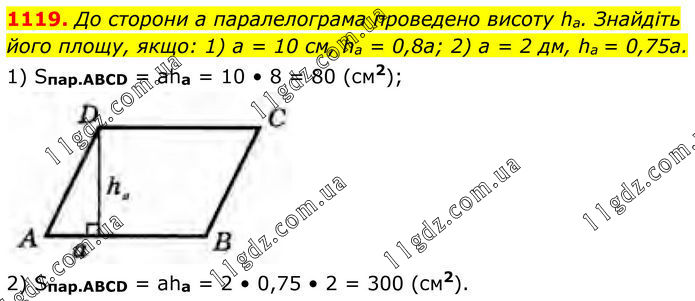 1119. До сторони а паралелограма проведено висоту ha. Знайдіть його площу, якщо: 1) а = 10 см, ha = 0,8a; 2) а = 2 дм, ha = 0,75a. 1) Sпар.ABCD = аha = 10 • 8 = 80 (см2); 2) Sпар.ABCD = аha = 2 • 0,75 • 2 = 300 (см2).