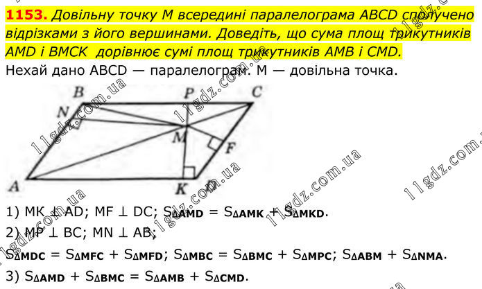 1153. Довільну точку M всередині паралелограма ABCD сполучено відрізками з його вершинами. Доведіть, що сума площ трикутників AMD і BMCK дорівнює сумі площ трикутників AMB і CMD. Нехай дано ABCD — паралелограм. М — довільна точка. 1) МК ⊥ AD; MF ⊥ DC; S∆AMD = S∆AMK + S∆MKD. 2) MP ⊥ ВС; MN ⊥ AB; S∆MDC = S∆MFC + S∆MFD; S∆MBC = S∆BMC + S∆MPC; S∆ABM + S∆NMA. 3) S∆AMD + S∆BMC = S∆AMB + S∆CMD.
