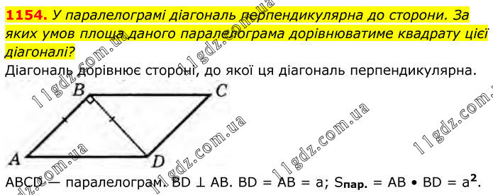 1154. У паралелограмі діагональ перпендикулярна до сторони. За яких умов площа даного паралелограма дорівнюватиме квадрату цієї діагоналі? Діагональ дорівнює стороні, до якої ця діагональ перпендикулярна. ABCD — паралелограм. BD ⊥ AB. BD = AB = a; Sпaр. = AB • BD = a2.