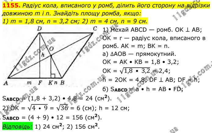 1155. Радіус кола, вписаного у ромб, ділить його сторону на відрізки довжиною m і n. Знайдіть площу ромба, якщо: 1) m = 1,8 см, n = 3,2 см; 2) m = 4 см, n = 9 см. 1) Нехай ABCD — ромб. OK ⊥ AB; OK = r — радіус кола, вписаного в ромб. АК = m; ВК = n. а) ∆АОВ — прямокутний. OК = АК • КВ = 1,8 • 3,2; ОK = √(1,8 • 3,2) = 2,4; h = 2OК = 4,8; DF ⊥ AB; DF = h; б) SABCD = a • h = AB • FD; SABCD = (1,8 + 3,2) • 4,8 = 24 (см2). 2) OK = √(4 • 9) = √36 = 6 (cм); h = 12 cм; SABCD = (4 + 9) • 12 = 156 (см2). Відповідь: 1) 24 см2; 2) 156 см2.