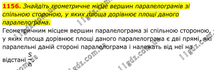 1156. Знайдіть геометричне місце вершин паралелограмів зі спільною стороною, у яких площа дорівнює площі даного паралелограма. Геометричним місцем вершин паралелограма зі спільною стороною, у яких площа дорівнює площі даного паралелограма є дві прямі, які паралельні даній стороні паралелограма і належать від неї на відстані S/h.