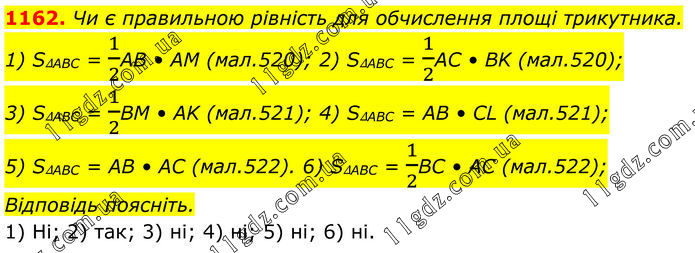 1162. Чи є правильною рівність для обчислення площі трикутника. 1) S∆ABC = 1/2AB • AM (мал.520); 2) S∆ABC = 1/2AC • BK (мал.520); 3) S∆ABC = 1/2BM • AK (мал.521); 4) S∆ABC = AB • CL (мал.521); 5) S∆ABC = AB • AC (мал.522). 6) S∆ABC = 1/2BC • AC (мал.522); Відповідь поясніть. 1) Hi; 2) так; 3) ні; 4) ні; 5) ні; 6) ні.