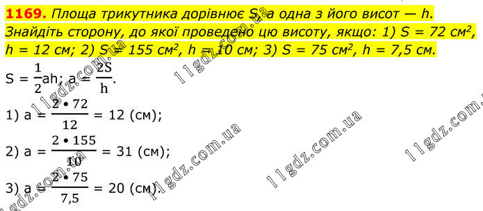 1169. Площа трикутника дорівнює S, а одна з його висот — h. Знайдіть сторону, до якої проведено цю висоту, якщо: 1) S = 72 см2, h = 12 см; 2) S = 155 см2, h = 10 см; 3) S = 75 см2, h = 7,5 см. S = 1/2ah; a = 2S/h. 1) a = (2 • 72)/12 = 12 (см); 2) a = (2 • 155)/10 = 31 (см); 3) a = (2 • 75)/7,5 = 20 (см).
