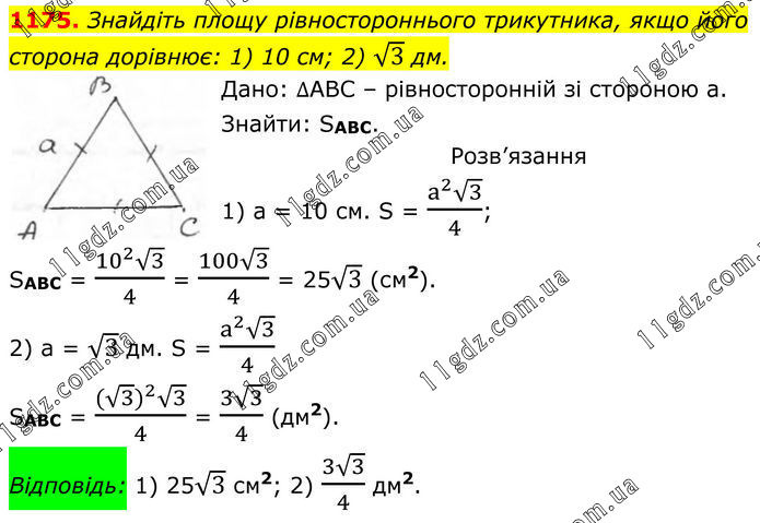 1175. Знайдіть площу рівностороннього трикутника, якщо його сторона дорівнює: 1) 10 см; 2) √3 дм. Дано: ∆АВС – рівносторонній зі стороною а. Знайти: SABC. Розв’язання 1) а = 10 см. S = (a^2 √3)/4; SАВС = (10^2 √3)/4 = (100√3)/4 = 25√3 (см2). 2) а = √3 дм. S = (a^2 √3)/4; SABC = (〖(√3)〗^2 √3)/4 = (3√3)/4 (дм2). Відповідь: 1) 25√3 см2; 2) (3√3)/4 дм2.