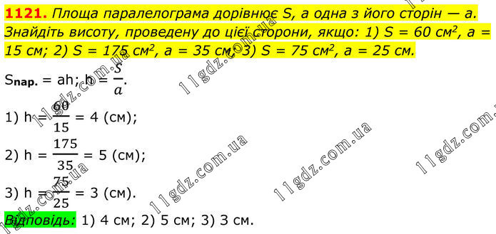 1121. Площа паралелограма дорівнює S, а одна з його сторін — a. Знайдіть висоту, проведену до цієї сторони, якщо: 1) S = 60 см2, a = 15 см; 2) S = 175 см2, a = 35 см; 3) S = 75 см2, a = 25 см. Snap. = ah; h = S/a. 1) h = 60/15 = 4 (см); 2) h = 175/35 = 5 (см); 3) h = 75/25 = 3 (см). Відповідь: 1) 4 см; 2) 5 см; 3) З см.