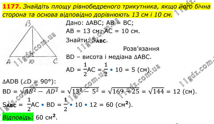1177. Знайдіть площу рівнобедреного трикутника, якщо його бічна сторона та основа відповідно дорівнюють 13 см і 10 см. Дано: ∆АВС; АВ = ВС; АВ = 13 см; АС = 10 см. Знайти: SABC. Розв’язання BD – висота і медіана ∆АВС. AD = 1/2AC = 1/2 • 10 = 5 (см). ∆ADB (∠D = 90°): BD = √(〖AB〗^2- 〖AD〗^2 ) = √(13^2- 5^2 ) = √(169-25) = √144 = 12 (см). SABC = 1/2AC • BD = 1/2 • 10 • 12 = 60 (см2). Відповідь: 60 см2.