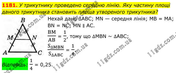 1181. У трикутнику проведено середню лінію. Яку частину площі даного трикутника становить площа утвореного трикутника? Нехай дано ∆АВС; MN — середня лінія; MB = МА; BN = NC; MN ∥ AC. BM/AB = 1/2, тому що ∆MBN ~ ∆ABC; S_∆MBN/S_∆ABC = 1/4. Відповідь: 1/4 = 0,25.