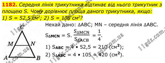 1182. Середня лінія трикутника відтинає від нього трикутник з площею S. Чому дорівнює площа даного трикутника, якщо: 1) S = 52,5 см2; 2) S = 105 см2? Нехай дано: ∆АВС; MN – середня лінія ∆АВС. S∆MCN = S. S_∆MCN/S_∆ACB = 1/4. 1) SABC = 4 • 52,5 = 210 (см2); 2) S∆ABC = 4 • 105 = 420 (см2).