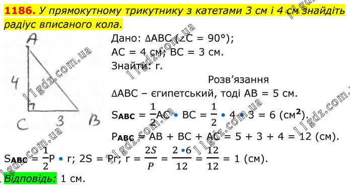 1186. У прямокутному трикутнику з катетами 3 см і 4 см знайдіть радіус вписаного кола. Дано: ∆АВС (∠С = 90°); АС = 4 см; ВС = 3 см. Знайти: r. Розв’язання ∆АВС – єгипетський, тоді АВ = 5 см. SABC = 1/2AC • BC = 1/2 • 4 • 3 = 6 (см2). PABC = AB + BC + AC = 5 + 3 + 4 = 12 (см). SABC = 1/2P • r; 2S = Pr; r = 2S/P = (2 •6)/12 = 12/12 = 1 (см). Відповідь: 1 см.