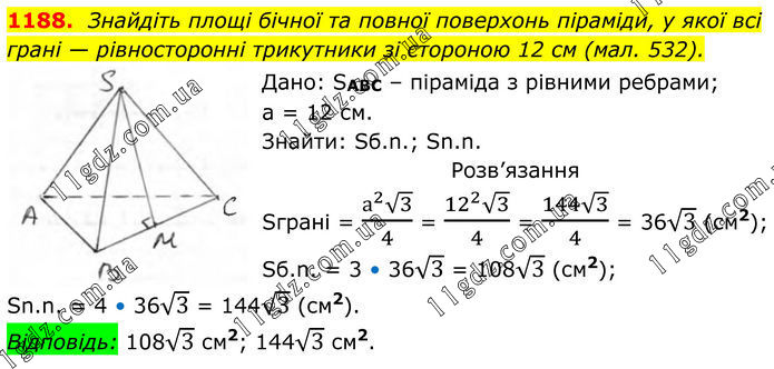 1188. Знайдіть площі бічної та повної поверхонь піраміди, у якої всі грані — рівносторонні трикутники зі стороною 12 см (мал. 532). Дано: SABC – піраміда з рівними ребрами; а = 12 см. Знайти: Sб.n.; Sn.n. Розв’язання Sграні = (а^2 √3)/4 = (12^2 √3)/4 = (144√3)/4 = 36√3 (см2); Sб.n. = 3 • 36√3 = 108√3 (см2); Sn.n. = 4 • 36√3 = 144√3 (см2). Відповідь: 108√3 см2; 144√3 см2.