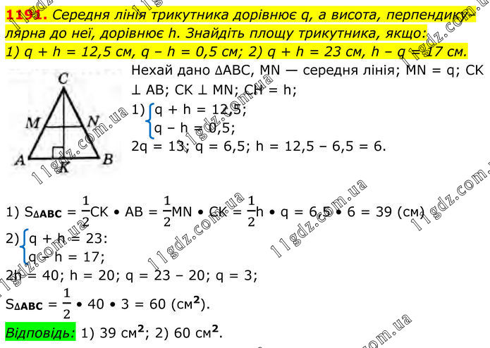 1191. Середня лінія трикутника дорівнює q, а висота, перпендику–лярна до неї, дорівнює h. Знайдіть площу трикутника, якщо: 1) q + h = 12,5 см, q – h = 0,5 см; 2) q + h = 23 cм, h – q = 17 cм. Нехай дано ∆ABC, MN — середня лінія; MN = q; CK ⊥ AB; CK ⊥ MN; CH = h; 1) q + h = 12,5; q – h = 0,5; 2q = 13; q = 6,5; h = 12,5 – 6,5 = 6. 1) S∆ABC = 1/2CK • AB = 1/2MN • CK = 1/2h • q = 6,5 • 6 = 39 (см) 2) q + h = 23: q – h = 17; 2h = 40; h = 20; q = 23 – 20; q = 3; S∆ABC = 1/2 • 40 • 3 = 60 (см2). Відповідь: 1) 39 см2; 2) 60 см2.
