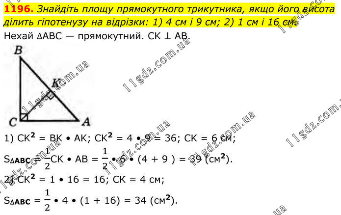 1196. Знайдіть площу прямокутного трикутника, якщо його висота ділить гіпотенузу на відрізки: 1) 4 см і 9 см; 2) 1 см і 16 см. Нехай ∆АВС — прямокутний. CK ⊥ AB. 1) CK2 = BK • AK; CK2 = 4 • 9 = 36; CK = 6 cм; S∆ABC = 1/2CK • AB = 1/2 • 6 • (4 + 9 ) = 39 (см2). 2) CK2 = 1 • 16 = 16; СК = 4 см; S∆ABC = 1/2 • 4 • (1 + 16) = 34 (см2).