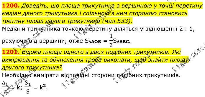 1200. Доведіть, що площа трикутника з вершиною у точці перетину медіан даного трикутника і спільною з ним стороною становить третину площі даного трикутника (мал.533). Медіани трикутника точкою перетину діляться у відношенні 2 : 1, рахуючи від вершини, отже S∆AOB = 1/3S∆ABC. 1201. Відома площа одного з двох подібних трикутників. Які вимірювання та обчислення треба виконати, щоб знайти площу другого трикутника? Необхідно виміряти відповідні сторони подібних трикутників. a_1/a = k; S_1/S = k2.