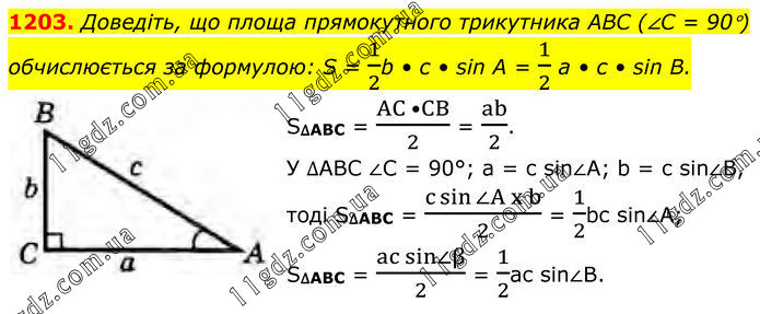 1203. Доведіть, що площа прямокутного трикутника ABC (∠C = 90°) обчислюється за формулою: S = 1/2b • с • sin А = 1/2 а • с • sin В. S∆ABC = (AC •CB)/2 = ab/2. У ∆ABC ∠C = 90°; a = c sin∠A; b = c sin∠B, тоді S∆ABC = (c sin〖∠A x b〗)/2 = 1/2bc sin∠A; S∆ABC = (ac sin∠β)/2 = 1/2ac sin∠B.