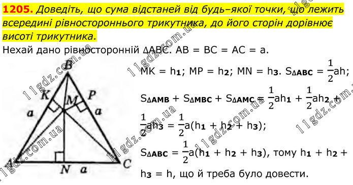 1205. Доведіть, що сума відстаней від будь–якої точки, що лежить всередині рівностороннього трикутника, до його сторін дорівнює висоті трикутника. Нехай дано рівносторонній ∆ABC. АВ = ВС = АС = а. MK = h1; MP = h2; MN = h3. S∆ABC = 1/2ah; S∆AMB + S∆MBC + S∆AMC = 1/2ah1 + 1/2ah2 + 1/2ah3 = 1/2a(h1 + h2 + h3); S∆ABC = 1/2a(h1 + h2 + h3), тому h1 + h2 + h3 = h, що й треба було довести.