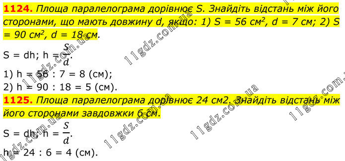 1124. Площа паралелограма дорівнює S. Знайдіть відстань між його сторонами, що мають довжину d, якщо: 1) S = 56 см2, d = 7 см; 2) S = 90 см2, d = 18 см. S = dh; h = S/d. 1) h = 56 : 7 = 8 (см); 2) h = 90 : 18 = 5 (см). 1125. Площа паралелограма дорівнює 24 см2. Знайдіть відстань між його сторонами завдовжки б см. S = dh; h = S/d. h = 24 : 6 = 4 (см).