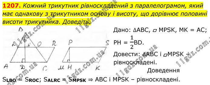 1207. Кожний трикутник рівноскладений з паралелограмом, який має однакову з трикутником основу і висоту, що дорівнює половині висоти трикутника. Доведіть. Дано: ∆АВС, MPSK, MK = AC; PH = 1/2BD. Довести: ∆АВС і MPSK – рівноскладені. Доведення SLBO = SROC; SALRC = SMPSK ⇒ ABC і MPSK – рівноскладені.