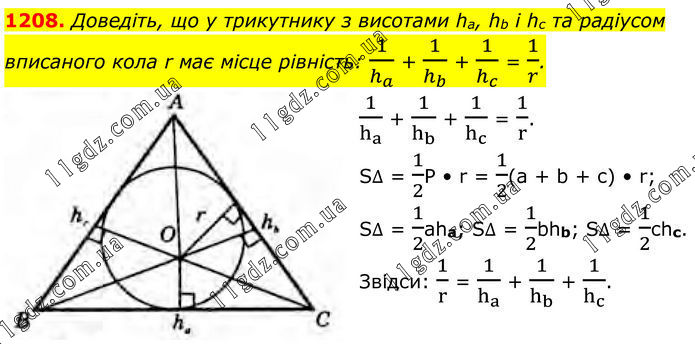 1208. Доведіть, що у трикутнику з висотами ha, hb і hc та радіусом вписаного кола r має місце рівність: 1/h_a + 1/h_b + 1/h_c = 1/r. 1/h_a + 1/h_b + 1/h_c = 1/r. S∆ = 1/2P • r = 1/2(a + b + c) • r; S∆ = 1/2aha; S∆ = 1/2bhb; S∆ = 1/2chc. Звідси: 1/r = 1/h_a + 1/h_b + 1/h_c .