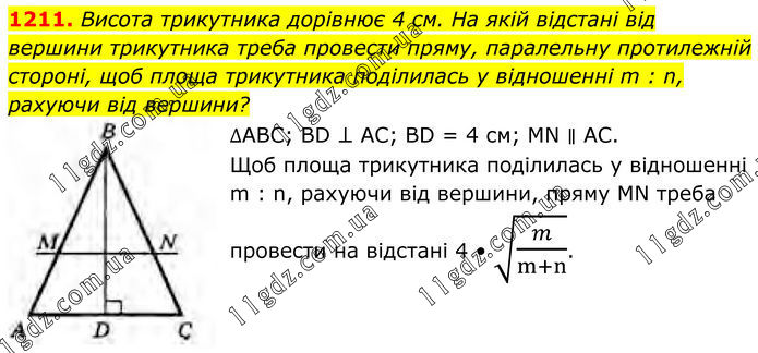 1211. Висота трикутника дорівнює 4 см. На якій відстані від вершини трикутника треба провести пряму, паралельну протилежній стороні, щоб площа трикутника поділилась у відношенні m : n, рахуючи від вершини? ∆АВС; BD ⊥ АС; BD = 4 см; MN ∥ АС. Щоб площа трикутника поділилась у відношенні m : n, рахуючи від вершини, пряму MN треба провести на відстані 4 • √(m/(m+n)).