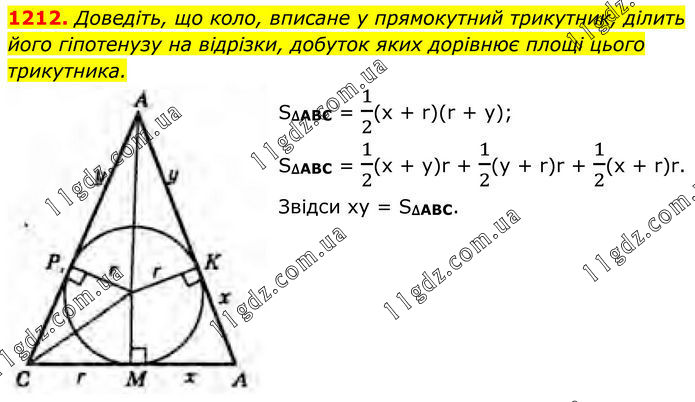 1212. Доведіть, що коло, вписане у прямокутний трикутник, ділить його гіпотенузу на відрізки, добуток яких дорівнює площі цього трикутника. S∆ABC = 1/2(x + r)(r + y); S∆ABC = 1/2(x + y)r + 1/2(y + r)r + 1/2(x + r)r. Звідси xy = S∆ABC.