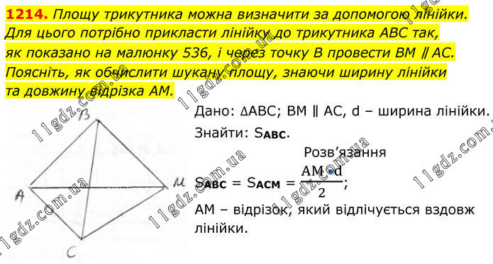 1214. Площу трикутника можна визначити за допомогою лінійки. Для цього потрібно прикласти лінійку до трикутника ABC так, як показано на малюнку 536, і через точку В провести BM ∥ AC. Поясніть, як обчислити шукану площу, знаючи ширину лінійки та довжину відрізка AM. Дано: ∆АВС; ВМ ∥ АС, d – ширина лінійки. Знайти: SABC. Розв’язання SABC = SACM = (AM •d)/2; AM – відрізок, який відлічується вздовж лінійки.