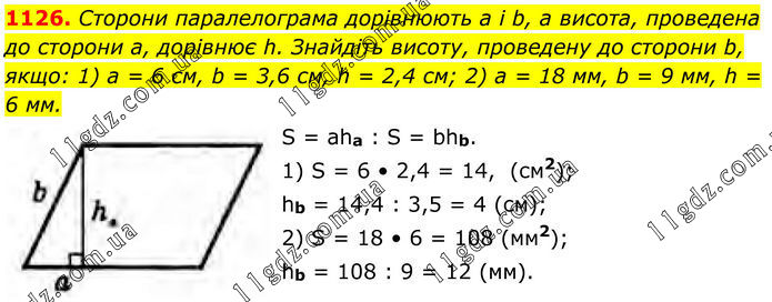 1126. Сторони паралелограма дорівнюють a і b, а висота, проведена до сторони a, дорівнює h. Знайдіть висоту, проведену до сторони b, якщо: 1) a = 6 см, b = 3,6 см, h = 2,4 см; 2) a = 18 мм, b = 9 мм, h = 6 мм. S = aha : S = bhb. 1) S = 6 • 2,4 = 14, (cм2); hb = 14,4 : 3,5 = 4 (см); 2) S = 18 • 6 = 108 (мм2); hb = 108 : 9 = 12 (мм).