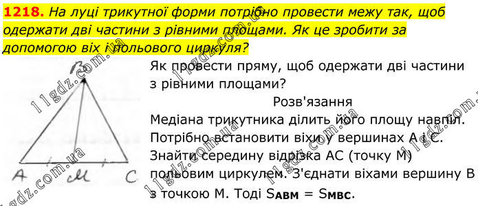 1218. На луці трикутної форми потрібно провести межу так, щоб одержати дві частини з рівними площами. Як це зробити за допомогою віх і польового циркуля? Як провести пряму, щоб одержати дві частини з рівними площами? Розв'язання Медіана трикутника ділить його площу навпіл. Потрібно встановити віхи у вершинах А і С. Знайти середину відрізка AC (точку М) польовим циркулем. З'єднати віхами вершину В з точкою М. Тоді SABM = SMBC.