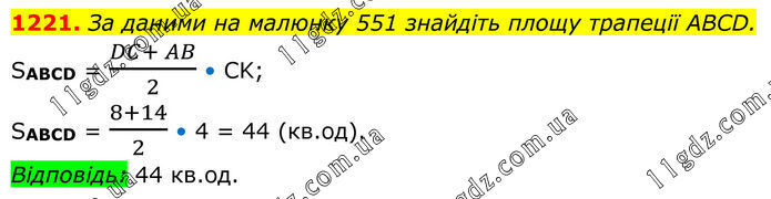 1221. За даними на малюнку 551 знайдіть площу трапеції ABCD. SABCD = (DC+ AB)/2 • CK; SABCD = (8+14)/2 • 4 = 44 (кв.од). Відповідь: 44 кв.од.