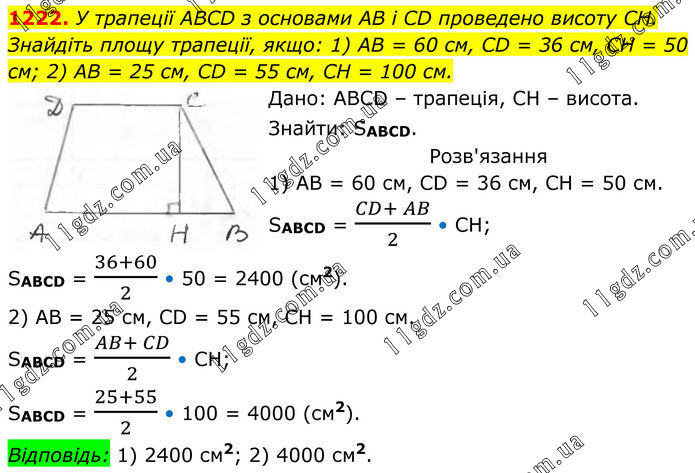 1222. У трапеції ABCD з основами AB і CD проведено висоту CH. Знайдіть площу трапеції, якщо: 1) AB = 60 см, CD = 36 см, CH = 50 см; 2) AB = 25 см, CD = 55 см, CH = 100 см. Дано: ABCD – трапеція, СН – висота. Знайти: SABCD. Розв'язання 1) АВ = 60 см, CD = 36 см, СН = 50 см. SABCD = (CD+ AB)/2 • CH; SABCD = (36+60)/2 • 50 = 2400 (см2). 2) AB = 25 см, CD = 55 см, СН = 100 см. SABCD = (AB+ CD)/2 • CH; SABCD = (25+55)/2 • 100 = 4000 (см2). Відповідь: 1) 2400 см2; 2) 4000 см2.