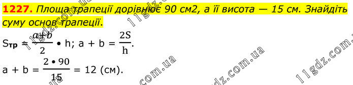 1227. Площа трапеції дорівнює 90 см2, а її висота — 15 см. Знайдіть суму основ трапеції. Sтр = (a+b)/2 • h; a + b = 2S/h. a + b = (2 • 90)/15 = 12 (см).