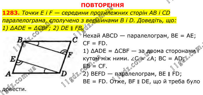 ПОВТОРЕННЯ 1283. Точки E і F — середини протилежних сторін AB і CD паралелограма, сполучено з вершинами B і D. Доведіть, що: 1) ∆ADE = ∆CBF; 2) DE ∥ FB. Нехай ABCD — паралелограм, BE = AE; CF = FD. 1) ∆ADE = ∆CBF — за двома сторонами і кутом між ними. ∠C = ∠A; BC = AD; ЕВ = CF. 2) BEFD — паралелограм, BE ∥ FD; BE = FD. Отже, BF ∥ DE, що й треба було довести.