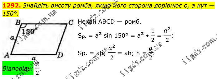 1292. Знайдіть висоту ромба, якщо його сторона дорівнює о, а кут — 150°. Нехай ABCD — ромб. Sp. = a2 sin 150° = a2 • 1/2 = a^2/2; Sp. = ah; a^2/2 = ah; h = a/2. Відповідь: a/2.