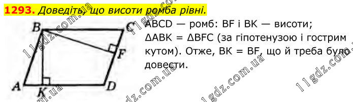 1293. Доведіть, що висоти ромба рівні. ABCD — ромб: BF і BK — висоти; ∆ABK = ∆BFC (за гіпотенузою і гострим кутом). Отже, ВК = BF, що й треба було довести.