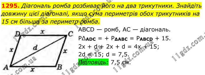 1295. Діагональ ромба розбиває його на два трикутники. Знайдіть довжину цієї діагоналі, якщо сума периметрів обох трикутників на 15 см більша за периметр ромба. ABCD — ромб, AC — діагональ. P∆ADC = + P∆ABC = РABCD + 15. 2x + d + 2x + d = 4x + 15; 2d = 15; d = 7,5. Відповідь: 7,5 см.
