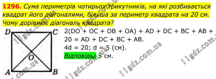 1296. Сума периметрів чотирьох трикутників, на які розбивається квадрат його діагоналями, більша за периметр квадрата на 20 см. Чому дорівнює діагональ квадрата? 2(DO + OC + OB + OA) + AD + DC + ВС + AB + 20 = AD + DC + ВС + AB. 4d = 20; d = 5 (см). Відповідь: 5 см.
