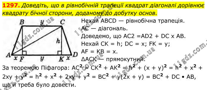1297. Доведіть, що в рівнобічній трапеції квадрат діагоналі дорівнює квадрату бічної сторони, доданому до добутку основ. Нехай ABCD — рівнобічна трапеція. AC — діагональ. Доведемо, що АС2 =AD2 + DC x AB. Hexaй CK = h; DC = x; FK = y; AF = KB = x. ∆ACK — прямокутний. За теоремою Піфагора: АС2 = СК2 + АК2 = h2 + (x + у)2 = h2 + x2 + 2ху + y2 = h2 + x2 + 2ху + у2 = ВС2 + у(2х + у) = ВС2 + DC • AB, що й треба було довести.