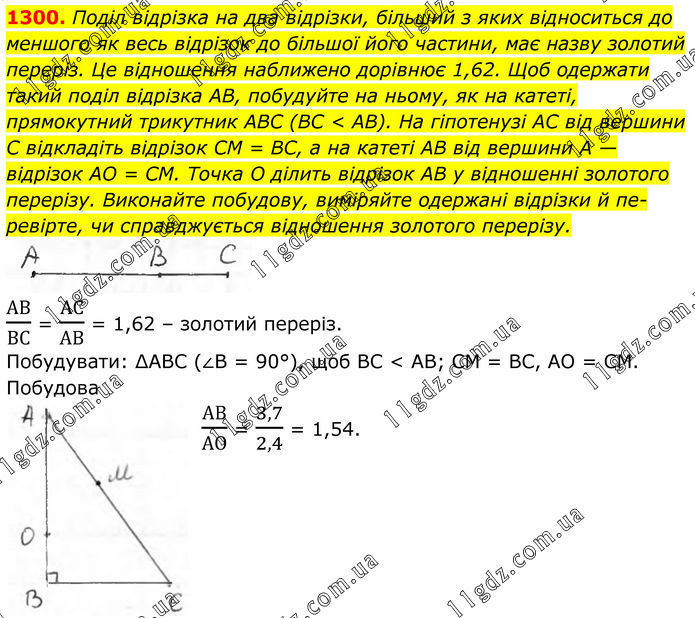 1300. Поділ відрізка на два відрізки, більший з яких відноситься до меншого як весь відрізок до більшої його частини, має назву золотий переріз. Це відношення наближено дорівнює 1,62. Щоб одержати такий поділ відрізка AB, побудуйте на ньому, як на катеті, прямокутний трикутник ABC (BC < АВ). На гіпотенузі AC від вершини C відкладіть відрізок CM = BC, а на катеті AB від вершини А — відрізок AO = CM. Точка O ділить відрізок AB у відношенні золотого перерізу. Виконайте побудову, виміряйте одержані відрізки й пе ревірте, чи справджується відношення золотого перерізу. АВ/ВС = АС/АВ = 1,62 – золотий переріз. Побудувати: ∆АВС (∠В = 90°), щоб ВС < АВ; СМ = ВС, АО = СМ. Побудова АВ/АО = 3,7/2,4 = 1,54.