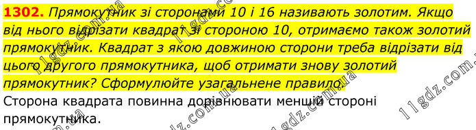 1302. Прямокутник зі сторонами 10 і 16 називають золотим. Якщо від нього відрізати квадрат зі стороною 10, отримаємо також золотий прямокутник. Квадрат з якою довжиною сторони треба відрізати від цього другого прямокутника, щоб отримати знову золотий прямокутник? Сформулюйте узагальнене правило. Сторона квадрата повинна дорівнювати меншій стороні прямокутника.