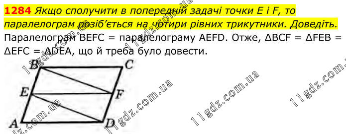 1284 Якщо сполучити в попередній задачі точки E і F, то паралелограм розіб’ється на чотири рівних трикутники. Доведіть. Паралелограм BEFC = паралелограму AEFD. Отже, ∆BCF = ∆FEB = ∆EFC = ∆DEА, що й треба було довести.