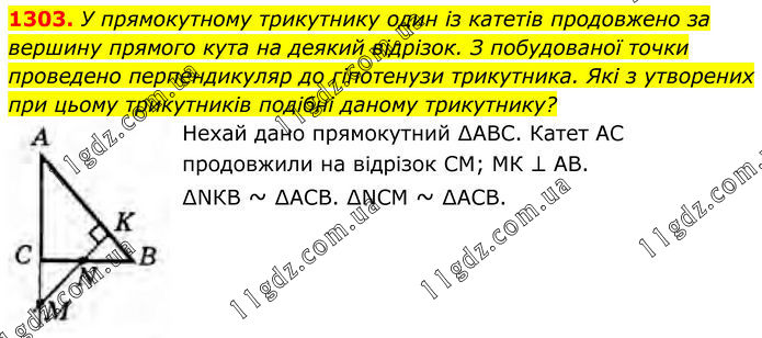1303. У прямокутному трикутнику один із катетів продовжено за вершину прямого кута на деякий відрізок. З побудованої точки проведено перпендикуляр до гіпотенузи трикутника. Які з утворених при цьому трикутників подібні даному трикутнику? Нехай дано прямокутний ∆АВС. Катет АС продовжили на відрізок CM; МК ⊥ АВ. ∆NКВ ~ ∆АСВ. ∆NCM ~ ∆АСВ.