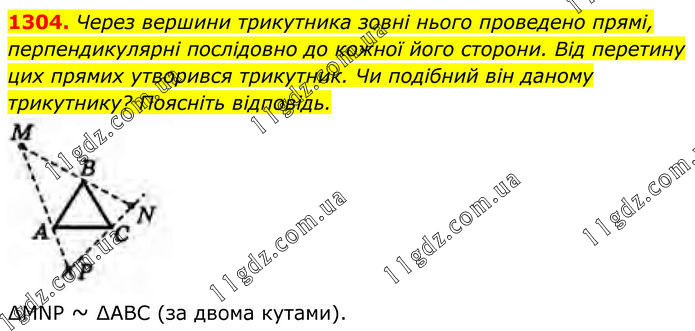 1304. Через вершини трикутника зовні нього проведено прямі, перпендикулярні послідовно до кожної його сторони. Від перетину цих прямих утворився трикутник. Чи подібний він даному трикутнику? Поясніть відповідь. ∆MNP ~ ∆АВС (за двома кутами).