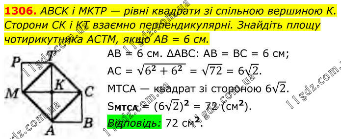 1306. ABCK і MKTP — рівні квадрати зі спільною вершиною К. Сторони СК і KT взаємно перпендикулярні. Знайдіть площу чотирикутника АСТМ, якщо AB = 6 см. AB = 6 см. ∆АВС: AB = ВС = 6 см; АС = √(6^2+6^2 ) = √72 = 6√2. МТСА — квадрат зі стороною 6√2. SMTCA = (6√2)2 = 72 (см2). Відповідь: 72 см2.