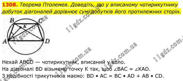 1308. Теорема Птолемея. Доведіть, що у вписаному чотирикутнику добуток діагоналей дорівнює сумі добутків його протилежних сторін. Нехай ABCD — чотирикутник, вписаний у коло. На діагоналі BD візьмемо точку К так, щоб ∠BAC = ∠KAD. З подібності трикутників маємо: BD • AC = BC • AD + AB • CD.