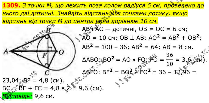 1309. З точки М, що лежить поза колом радіуса 6 см, проведено до нього дві дотичні. Знайдіть відстань між точками дотику, якщо відстань від точки M до центра кола дорівнює 10 см. АВ і АС — дотичні, OВ = OС = 6 см; АО = 10 см; OB ⊥ АВ; АО2 = АВ2 + ОВ2; АВ2 = 100 – 36; АВ2 = 64; АВ = 8 см. ∆АВО: BO2 = AO • FO; FО = 36/10 = 3,6 (см). ∆BFO: ВF2 = ВО2 – FO2 = 36 – 12,96 = 23,04; BF = 4,8 (см). ВС = BF + FC = 4,8 • 2 = 9,6 (см). Відповідь: 9,6 см.