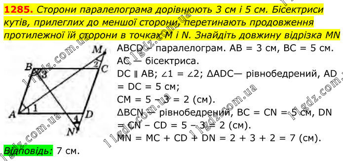 1285. Сторони паралелограма дорівнюють 3 см і 5 см. Бісектриси кутів, прилеглих до меншої сторони, перетинають продовження протилежної їй сторони в точках M і N. Знайдіть довжину відрізка MN ABCD – паралелограм. AB = 3 см, BC = 5 см. АС — бісектриса. DC ∥ AB; ∠1 = ∠2; ∆АDС— рівнобедрений, AD = DC = 5 см; СМ = 5 – 3 = 2 (см). ∆BCN — рівнобедрений, ВС = CN = 5 см, DN = CN – CD = 5 – 3 = 2 (см). MN = MC + CD + DN = 2 + 3 + 2 = 7 (cм). Відповідь: 7 см.