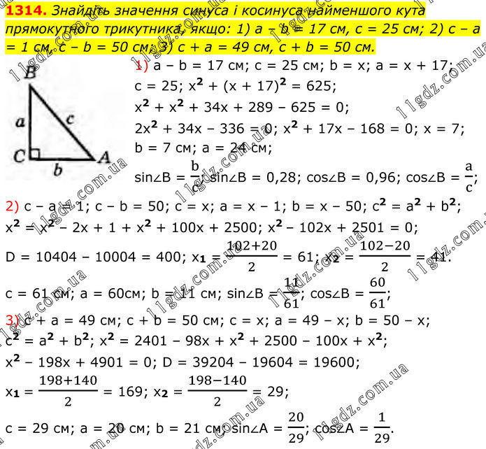 1314. Знайдіть значення синуса і косинуса найменшого кута прямокутного трикутника, якщо: 1) а – b = 17 см, с = 25 см; 2) с – a = 1 см, с – b = 50 см; 3) с + a = 49 см, с + b = 50 см. 1) a – b = 17 cм; с = 25 см; b = х; а = х + 17; c = 25; x2 + (x + 17)2 = 625; x2 + x2 + 34x + 289 – 625 = 0; 2x2 + 34x – 336 = 0; x2 + 17x – 168 = 0; x = 7; b = 7 cм; а = 24 cм; sin∠B = b/c; sin∠B = 0,28; cos∠B = 0,96; cos∠B = a/c; 2) c – a = 1; c – b = 50; c = x; a = x – 1; b = x – 50; c2 = a2 + b2; x2 = x2 – 2x + 1 + x2 + 100x + 2500; x2 – 102x + 2501 = 0; D = 10404 – 10004 = 400; x1 = (102+20)/2 = 61; x2 = (102-20)/2 = 41. с = 61 см; а = 60см; b = 11 см; sin∠B = 11/61; cos∠B = 60/61; 3) с + а = 49 см; с + b = 50 см; c = x; а = 49 – х; b = 50 – х; с2 = а2 + b2; х2 = 2401 – 98x + x2 + 2500 – 100x + x2; х2 – 198x + 4901 = 0; D = 39204 – 19604 = 19600; x1 = (198+140)/2 = 169; x2 = (198-140)/2 = 29; с = 29 см; а = 20 см; b = 21 см; sin∠A = 20/29; cos∠A = 1/29.