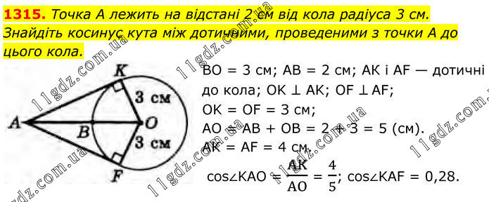 1315. Точка А лежить на відстані 2 см від кола радіуса 3 см. Знайдіть косинус кута між дотичними, проведеними з точки А до цього кола. BO = 3 см; AB = 2 см; АК і AF — дотичні до кола; OK ⊥ AK; OF ⊥ AF; OK = OF = З см; АО = AB + OB = 2 + З = 5 (см). АК = AF = 4 см. cos∠KAO = AK/AO = 4/5; соs∠KAF = 0,28.