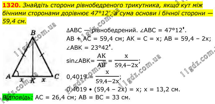 1320. Знайдіть сторони рівнобедреного трикутника, якщо кут між бічними сторонами дорівнює 47°12', а сума основи і бічної сторони — 59,4 см. ∆ABC — рівнобедрений. ∠ABC = 47°12'. AB + AC = 59,4 cм; AК = C = х; AB = 59,4 – 2x; ∠ABK = 23°42'. sin∠ABК= AK/AB = x/(59,4-2x); 0,4019 = x/(59,4-2x); 0,4019 • (59,4 – 2x) = x; x = 13,2 cм. Відповідь: AC = 26,4 cм; AB = BC = 33 cм.
