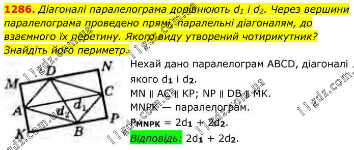 1286. Діагоналі паралелограма дорівнюють d1 і d2. Через вершини паралелограма проведено прямі, паралельні діагоналям, до взаємного їх перетину. Якого виду утворений чотирикутник? Знайдіть його периметр. Нехай дано паралелограм ABCD, діагоналі якого d1 і d2. MN ∥ AC ∥ KP; NP ∥ DB ∥ MK. MNPK — паралелограм. PMNPK = 2d1 + 2d2. Відповідь: 2d1 + 2d2.